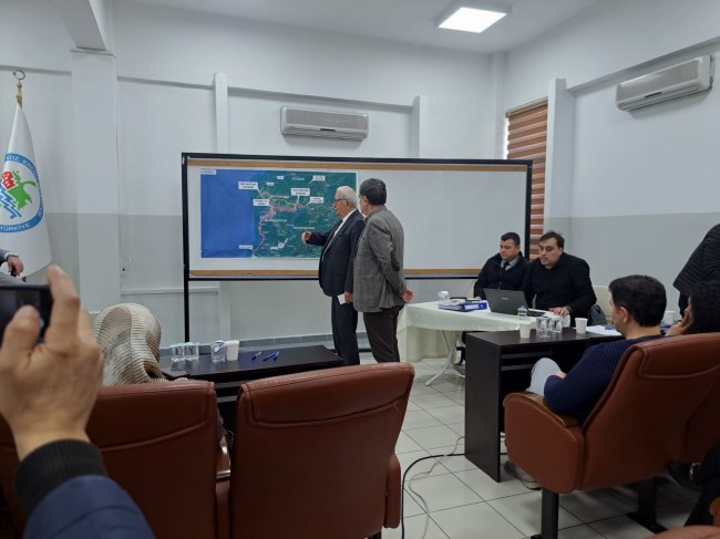 Fen İşleri Müdürü Oğuz Cömert, harita üzerinde bilgilendirme yaparak, “Dolgu alanları tamamlandıktan sonra denize dolgu yapmış olacak, o zaman yolu genişletmiş olacağız. Dolgu alanı olarak buradan başlıyoruz yukarıya kadar gidiyoruz. Buradan başlıyoruz, şurası zaten deniz o kadar dolmuş olacak. Ondan sonra dalga kıranlar... Bu dalga kıranlar olduktan sonra gemilerin girişi, bu dalga kıranlar belirlenecek. O zaman en azından rüzgarlı havalarda falan hiçbir yerden etkilenmeden direkt limana girebiliyor, herhangi bir şeyden etkilenmeyecek” şeklinde konuştu.