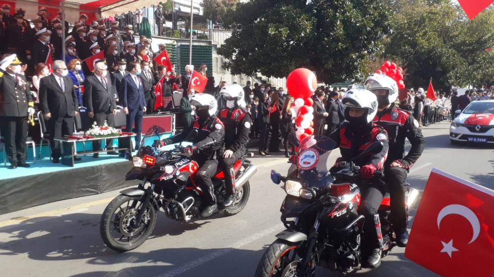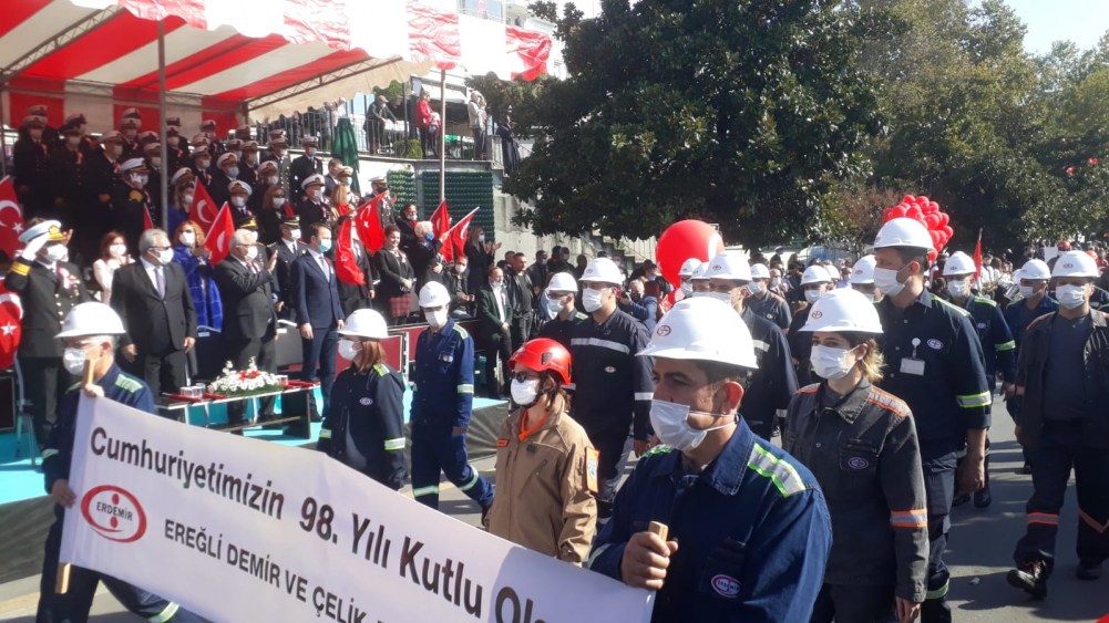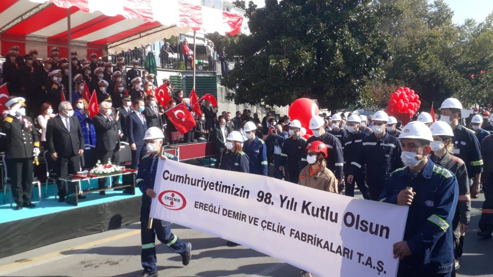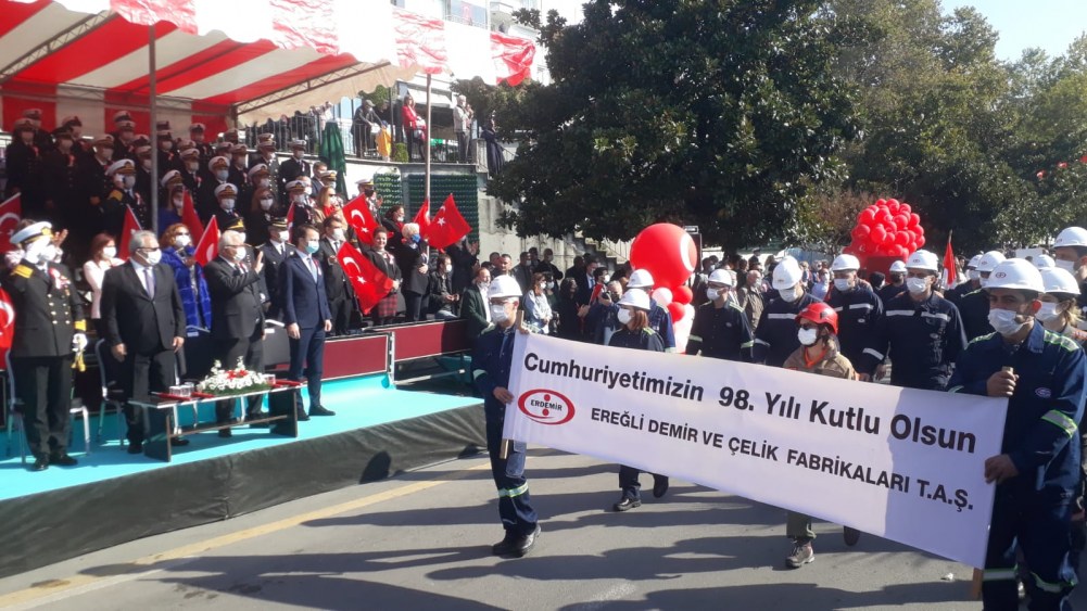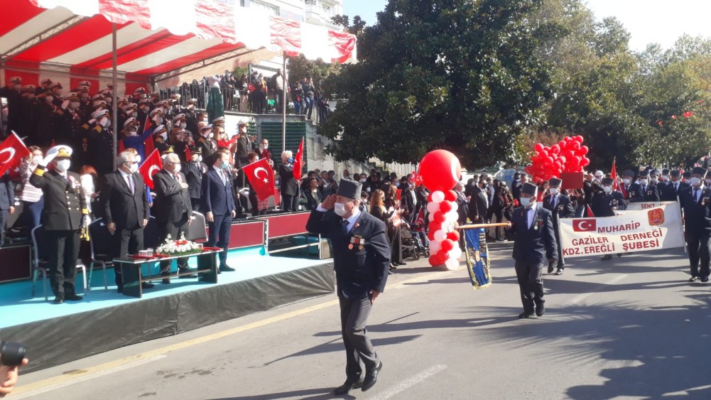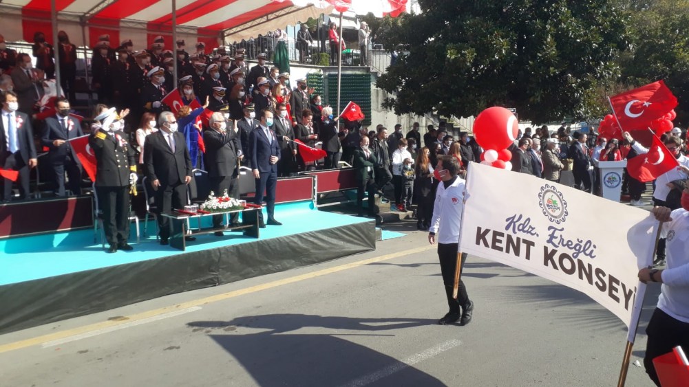 Atatürk Bulvarı’nda gerçekleştirilen törende ilk olarak Kdz. Ereğli Kaymakamı Mehmet Yapıcı, Karadeniz Bölge ve Garnizon Komutanı Tuğamiral Niyazi Uğur ve Kdz. Ereğli Belediye Başkanı Halil Posbıyık, askeri cipin üzerinden vatandaşları selamlayarak bayramlarını kutladılar. Daha sonra saygı duruşunda bulunuldu ve Istiklal Marşı okundu.